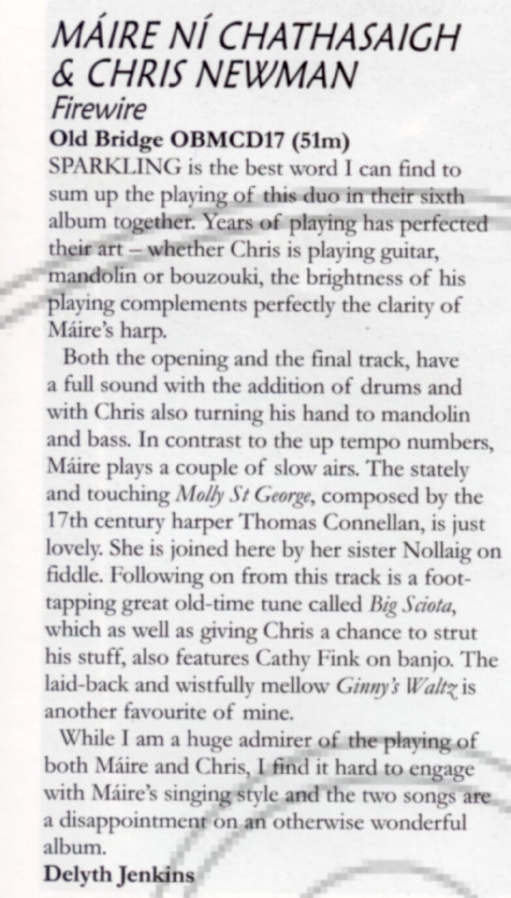 FireWire (Old Bridge Music/Proper) Robin Denselow Joanna Newsom may be the highest-profile harp player in the world right now, but when it comes to virtuoso work on this ancient and delicate instrument, the Irish player Maire Ni Chathasaigh is in a class of her own. Many of the best tracks here are jigs or airs that date back to the 17th century, played with delicacy, verve and a lightness of touch that should strengthen her reputation among a mainstream audience, not just folk purists, for she is certainly not just a traditionalist. There are echoes of anything from jazz to bluegrass, with the harp matched against |