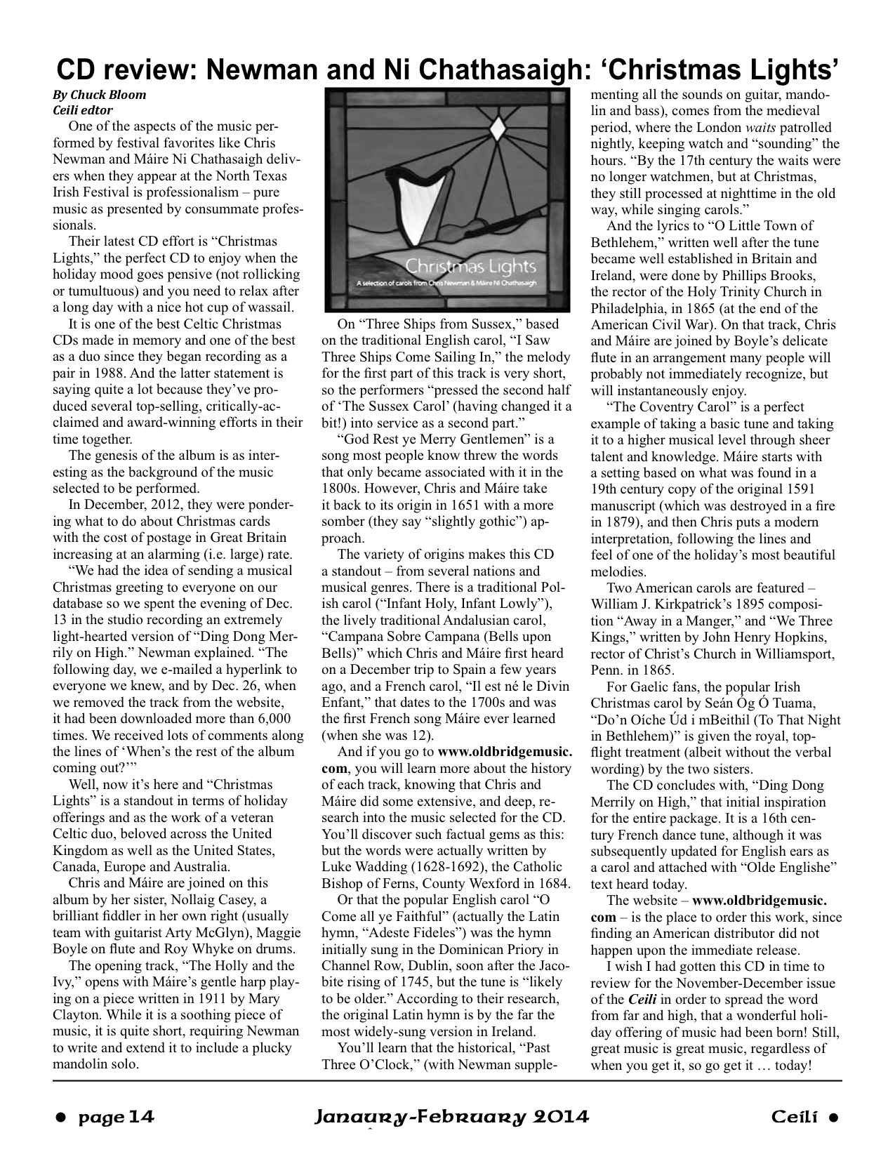 Chris and Máire interpret some well-known carols with not-so-well-known arrangements, such as ‘The Holly And The Ivy’, ‘Three Ships From Sussex’ and ‘God Rest Ye Merry Gentlemen’, while Maggie’s flute is positively dancing in ‘Oh Little Town Of Bethlehem’ and Nollaig contributes some beautiful fiddle as well. However, they choose several unfamiliar and rarely-heard peices, such as the Spanish carol ‘Campana Sobre Campana’, ‘Past Three O’Clock’, ‘Il est Né Le Divin Enfant’, the entrancing and delicate Irish Gaelic carol ‘Do’n Oiche Úd I mBeithil’ (To That Night In Bethlehem) and ‘Infant Holy’. The album ends with the wildly celebratory ‘Ding Dong Merrily On High’; this carol borrows from the smouldering and sexy French dance tune ‘Bransle De L’Officiel’, and Chris and Maire have an absolute ball playing it. This is one Christmas present to be treasured!